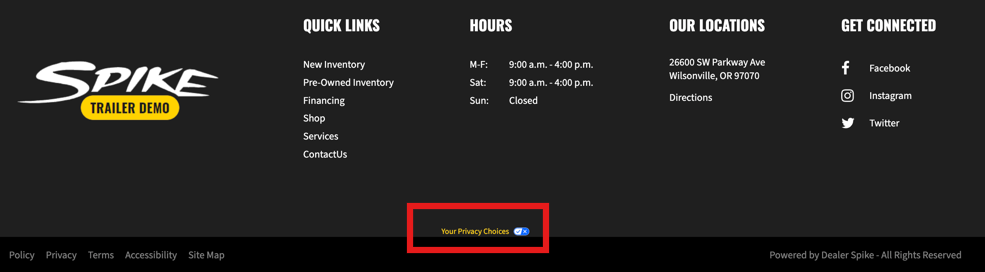 Consent Management is built into your website, aiding in compliance while you stay focused on sales and managing your dealership. A button labeled “Your Privacy Choices” in your website footer allows visitors to review how their data is used and, if they choose, opt out of advertising tracking. It’s simple, transparent, and sends a message that your dealership respects its customers as people, not just leads.